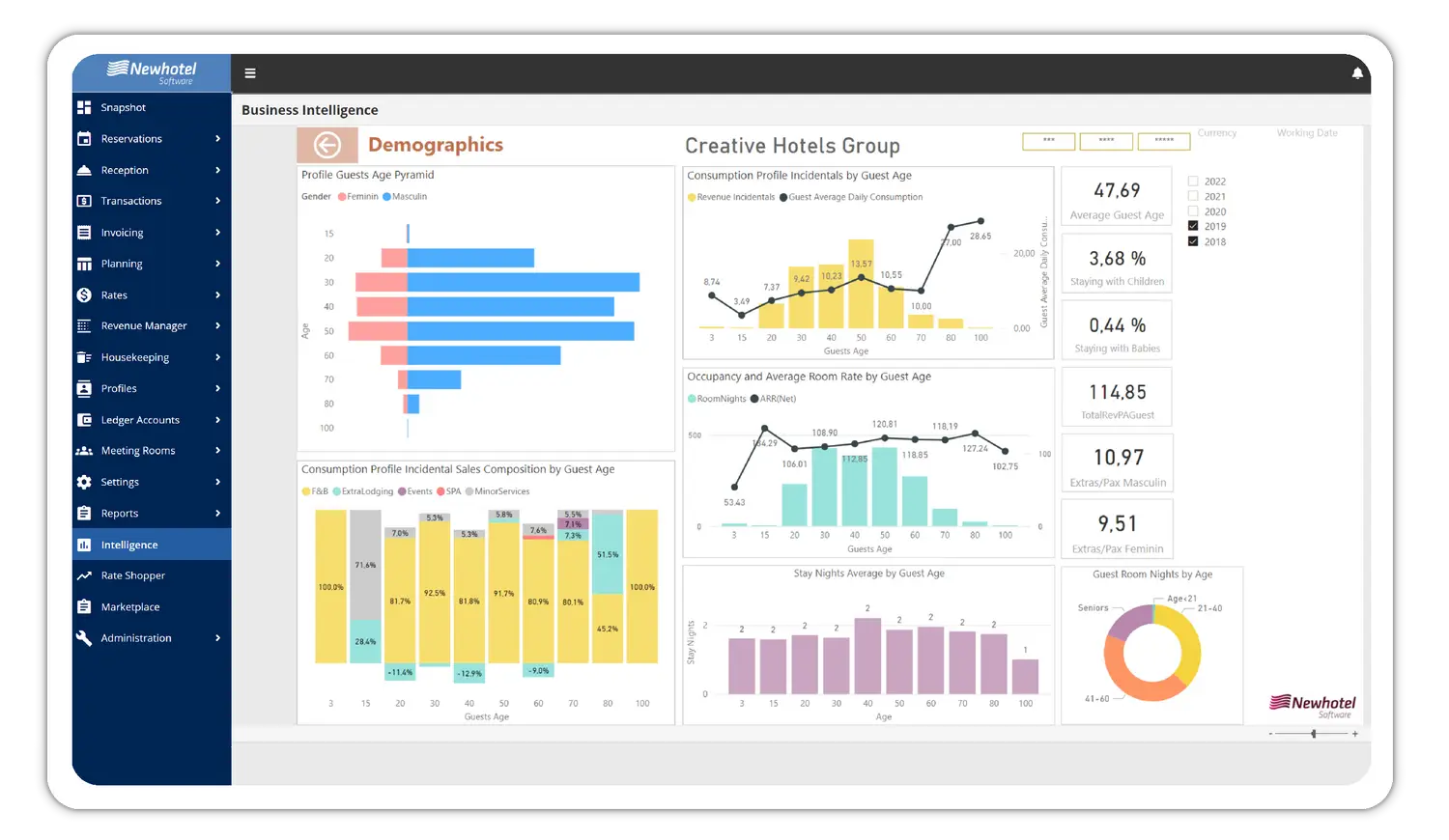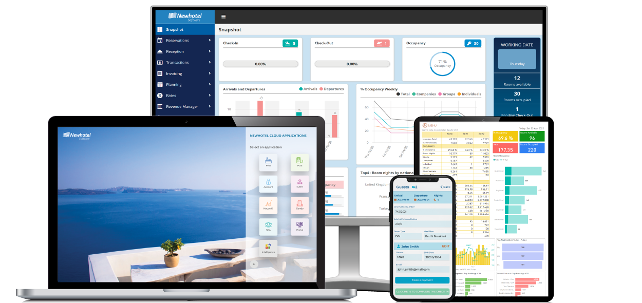 Newhotel Cloud is a complete package of software applications for Hotel Management. It includes the Property Management System (PMS) and a suite of modules for Revenue Management (RMS), Online Sales for main IDS, GDS and Channel Managers, Housekeeper, Points-of-Sale (POS), F&B Stocks and Inventories, SPA & Wellness, Events, Mobile Apps, Business Intelligence, hundreds of Third Party interfaces and API integrations.