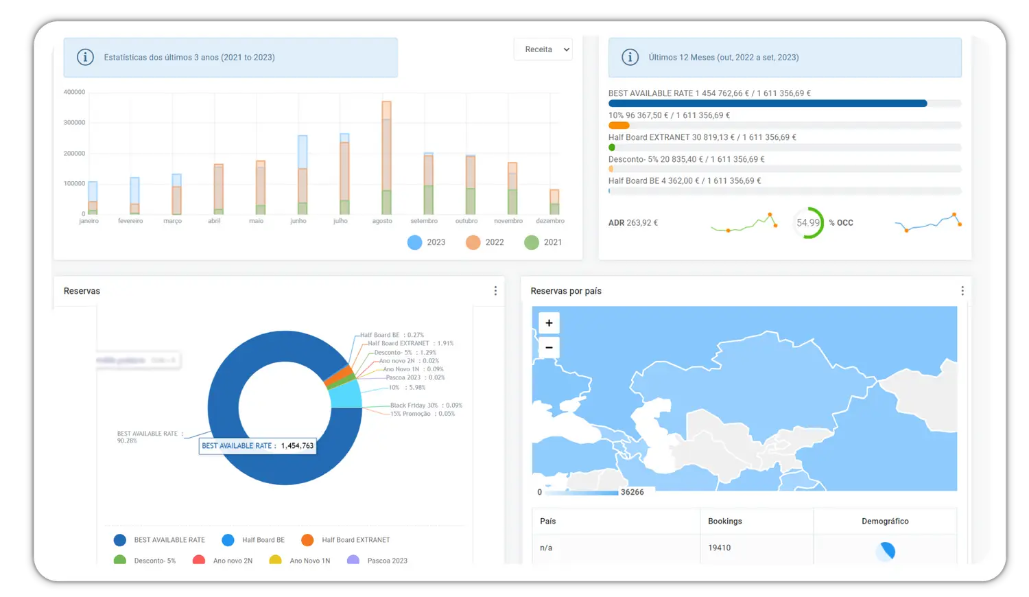Occupancy, Revenue, Uniform System analysis, Markets, Bookings Pick-up, Early Bookings, Online Sales, Companies, Guest Profiles, Demographics, Seasonality, History, Production by Department, Price-Demand Curve, WTP (Willingness To Pay) and Forecasting tools for playing with future scenarios are some of the report analytics offered by the Newhotel Business Intelligence.