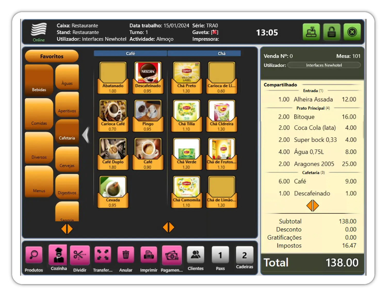 The perfect POS solution for Restaurants and Bars in the Hotel environment. It supports all the most sophisticated features such as touch screen operation, configurable buttons, quick sale, discounts, happy hour prices, split-check, follow-me, ticket look-up, plan of tables, salons, invoicing, account transfer, table position, room charges, credit control by guest.