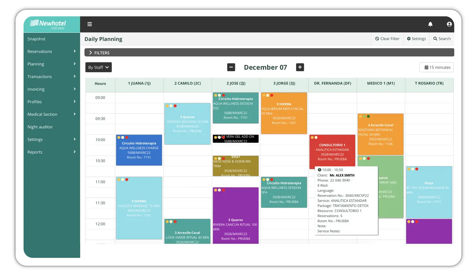 Top quality of service and guest attention are guaranteed by features such as guest profile of preferences, individual choice of therapist and/or gender, register of allergies and medical module for health indicators and consultations record.